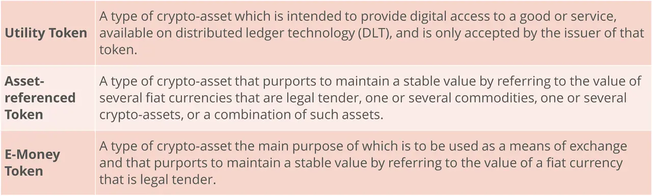 MiCA makes provision for the following types of crypto-assets;
